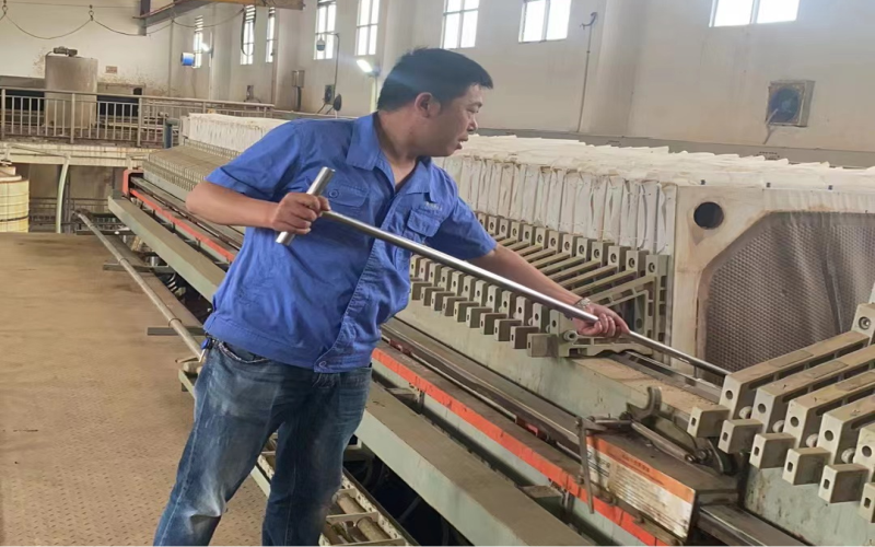 該廠一期脫泥設(shè)備為板框式壓濾機,經(jīng)處理后的污泥為含水率低于60%的干污泥,從調(diào)質(zhì)進泥到壓榨出泥需要5小時左右,一次能生產(chǎn)約4噸干污泥。該設(shè)備在完成每一次的壓濾后,需要人工將干污泥從板框上鏟除,尤其是夏季,車間溫度最高可達(dá)43度,空氣中散發(fā)的污泥惡臭氣更加濃重,他們從不退縮,堅守崗位10余小時。