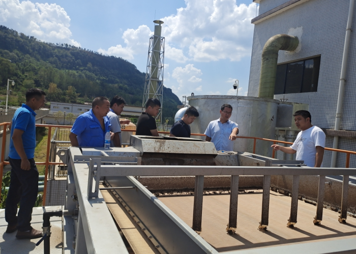 (現(xiàn)場查看污泥處理設(shè)備運行情況)